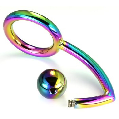 Penisring med analkule i regnbuefarget metall. Finnes i to str: 45 mm og 50 mm.